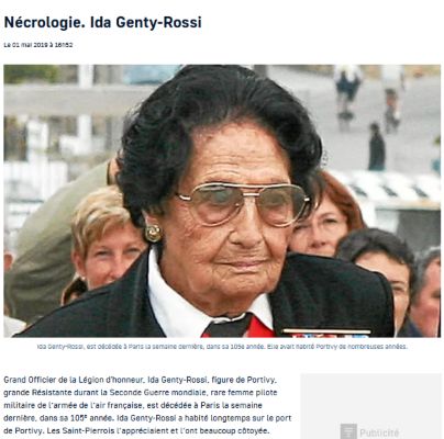 Ida GENTY-ROSSI, née Constanza Ida Augusta ASSAEL le 31 octobre 1914 à Barcelone, est l’une des figures emblématiques de la Résistance française durant la Seconde Guerre mondiale et une aviatrice pionnière dans l’Armée de l’air. Son parcours exceptionnel incarne la détermination, le courage et l’engagement, non seulement face à l’occupant nazi, mais aussi dans sa lutte pour la reconnaissance des femmes dans les corps militaires, en particulier l’aviation. Son parcours nous touche particulièrement parce qu’elle a partagé la vie de notre commune, à Portivy, à partir des années 1960.