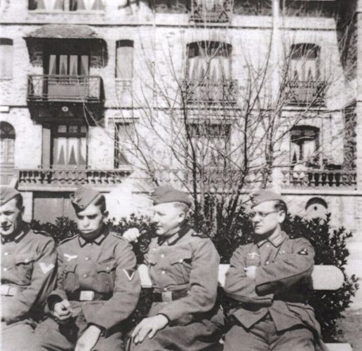 Karl LANG à droite avec les lunettes (son grade est identifiable par le col carré sur un rond de laine foncée de sa veste, il porte un modèle de veste modifiée en 1940, col vert de gris, avec épaulettes vert foncé).