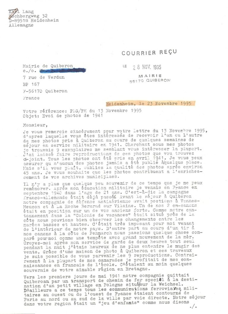 Le 28 novembre 1995 la mairie de Quiberon reçoit une lettre de Karl Lang avec des photos qu'il a faites lorsqu'il était militaire à Quiberon pendant l'Occupation.