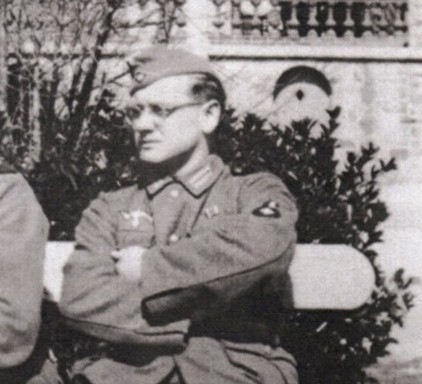 Karl LANG à droite avec les lunettes (son grade est identifiable par le col carré sur un rond de laine foncée de sa veste, il porte un modèle de veste modifiée en 1940, col vert de gris, avec épaulettes vert foncé).