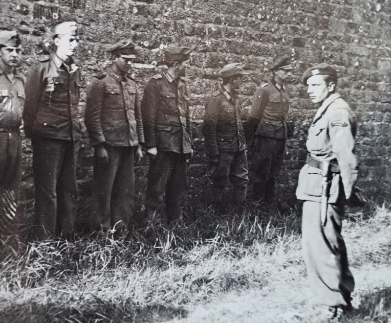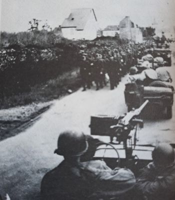 Le 10 mai, à 12 h 01, le Commandant du 1er bataillon JUDES, la 6ème Compagnie et ses officiers accompagnés de deux autres compagnies (2ème et 4ème ainsi que d’une section de la 3ème) franchissent la ligne de front et investissent dans la presqu’île les objectifs fixés par le commandant BIRON qui coiffe l’opération. Ils sont accompagnés d’engins motorisés américains. A 13 h 35, suite à la reddition des Allemands, une section du 1er bataillon accompagne vers l’abbaye de Kergonan une colonne de prisonniers ennemis (voir photo) constituée de 11 officiers, 122 sous-officiers et 496 hommes du rang. Un médecin et des blessés allemands sont maintenus à Saint-Pierre.