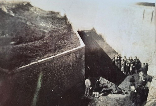 Des prisonniers allemands du fort de Penthièvre donnent des indications sur le lieu d’inhumation des corps ; le 14 mai, commencent des fouilles sous la direction du commandant de santé WOLFROMM, médecin du 4ème R.I.A. Elles sont effectuées par des prisonniers allemands encadrés par le lieutenant MARIDA (avec le béret sur les photos ci-dessous). Au total, 52 corps sont exhumés. Leur examen par les autorités militaires et judiciaires permet l’identification de plusieurs des victimes et révèle des marques indiscutables de tortures et de supplices.