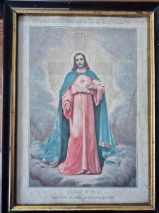 Le café était un lieu de rencontre très important dans les villages….une grande majorité de la population était catholique et pratiquante….nous avons retrouvé ce cadre représentant le Christ, et curieusement celui-ci porte au verso une marque de distribution « Café Bar » située à Paris, et destiné au café des « 4 kilomètres » de Mme Veuve Le Bourgès. Les images saintes après guerre étaient encore présentes, bien que relativement rares, dans les cafés à cette époque. L’église n’était jamais bien loin pour rappeler sans doute aux habitués du café que l’alcool était à consommer avec modération….